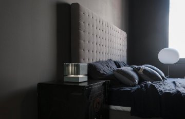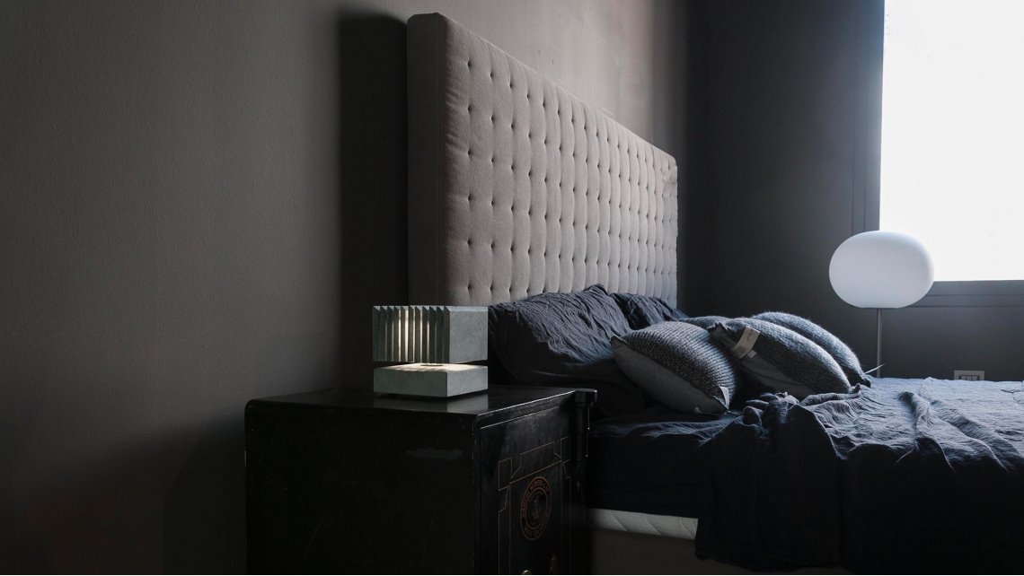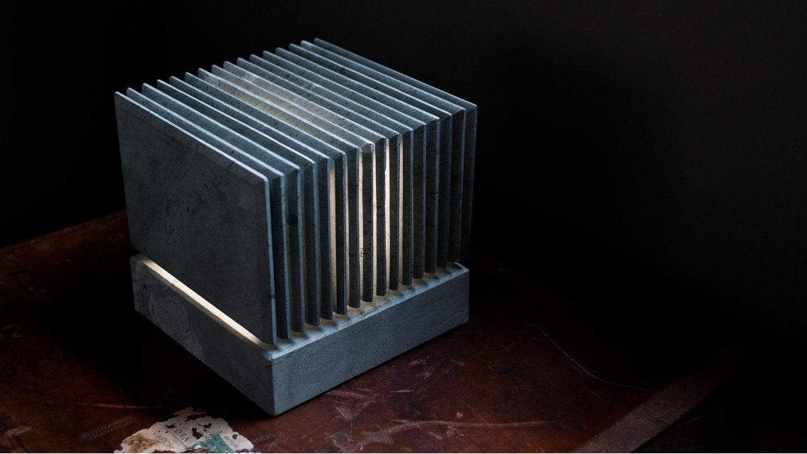 Si tratta di un cubo di pietra solido e compatto, ma contraddittoriamente sospeso dal piano d’appoggio. La luce taglia la pietra, in prima battuta in orizzontale spaccando letteralmente in due la geometria regolare, secondariamente in verticale, rendendo l’elemento superiore in grado di diffondere la luce.