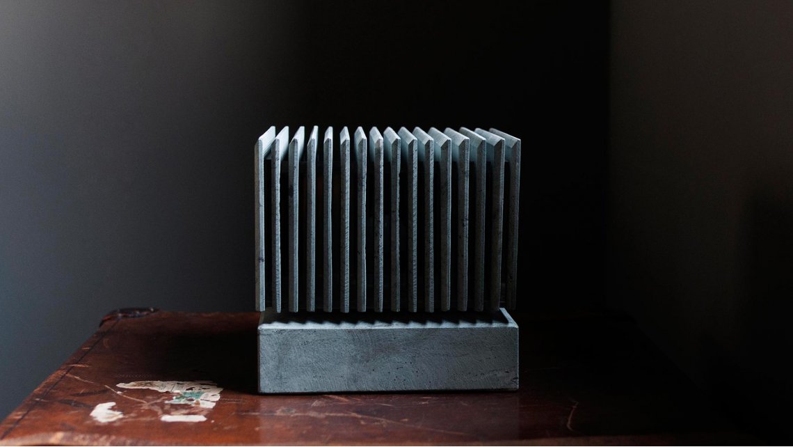 It is a solid and compact stone cube, but contradictorily suspended from the bearing plane. The light visually cut horizontally the cube in two elements. The top element seems to become lightweight and thanks to the vertical light slits it detaches itself from the base. The intention is to exceed the limit of the material making the stone appear such as light and translucent.